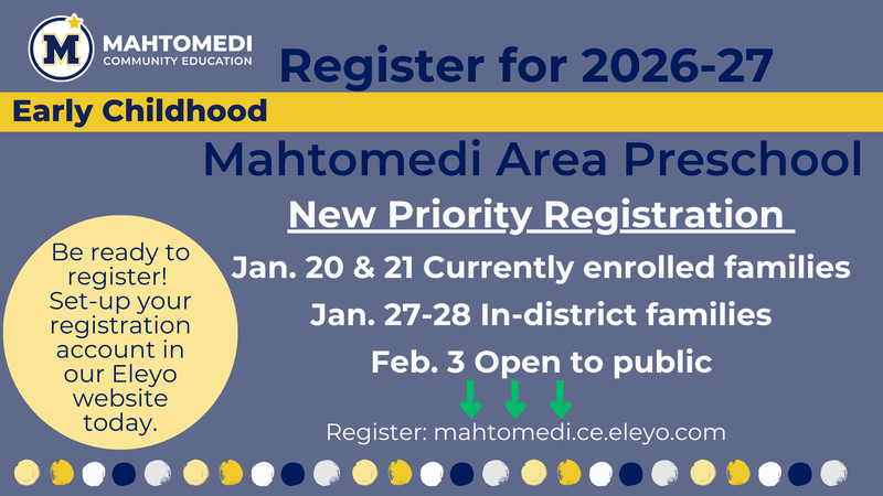 Mahtomedi Early Childhood Screening appointments are available September-May. New screening appointments will be available online on the 15th of each month at 8:00am. For Screening Questions or Information please contact: Jessica Rehfeld at 651-407-2017
